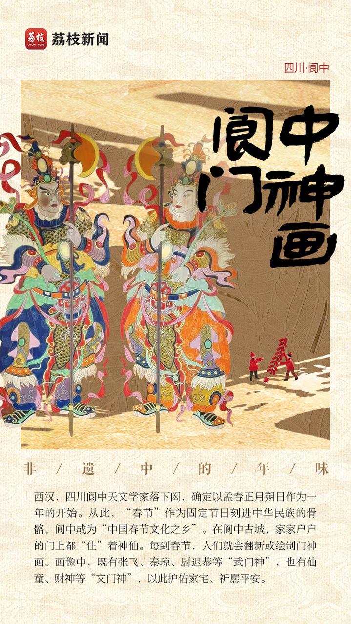 阆中是文化比较深厚的历史古城,春节民俗丰富多彩,每年春节临近时,阆中百姓就开始准备年画(包括门神画)、对联等来祈求新年风调雨顺,事事如意的美好向望。每年阆中从腊月初八就开始举行各种形式地民俗非遗活动,舞龙舞狮、“春节老人”赐福、贴春联、坐花轿、亮花鞋……各式各样独具风情的春节民俗活动将传统年味融入到城市的每一个角落。