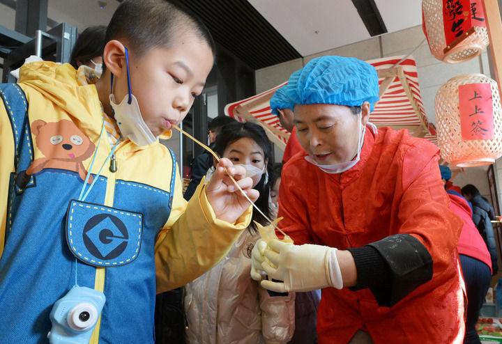 2025年1月29日,小朋友在位于北京的中国非物质文化遗产馆举行的“过年——春节主题展”上体验“吹糖人”。新华社记者 李贺 摄