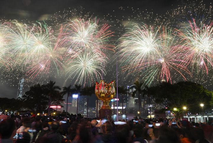 2025年1月30日,烟花在香港维多利亚港上空绽放,欢庆新春佳节。新华社记者 陈铎 摄
