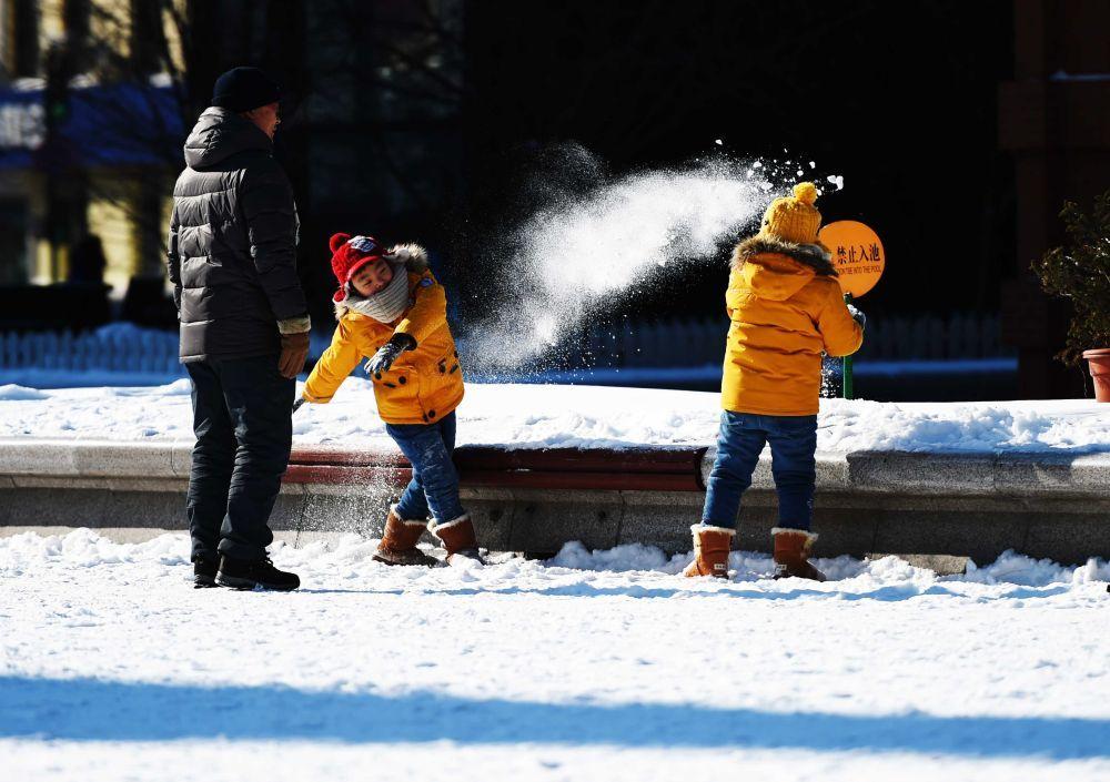 2017年2月20日,在哈尔滨市索菲亚教堂广场上,两名小朋友在打雪仗。