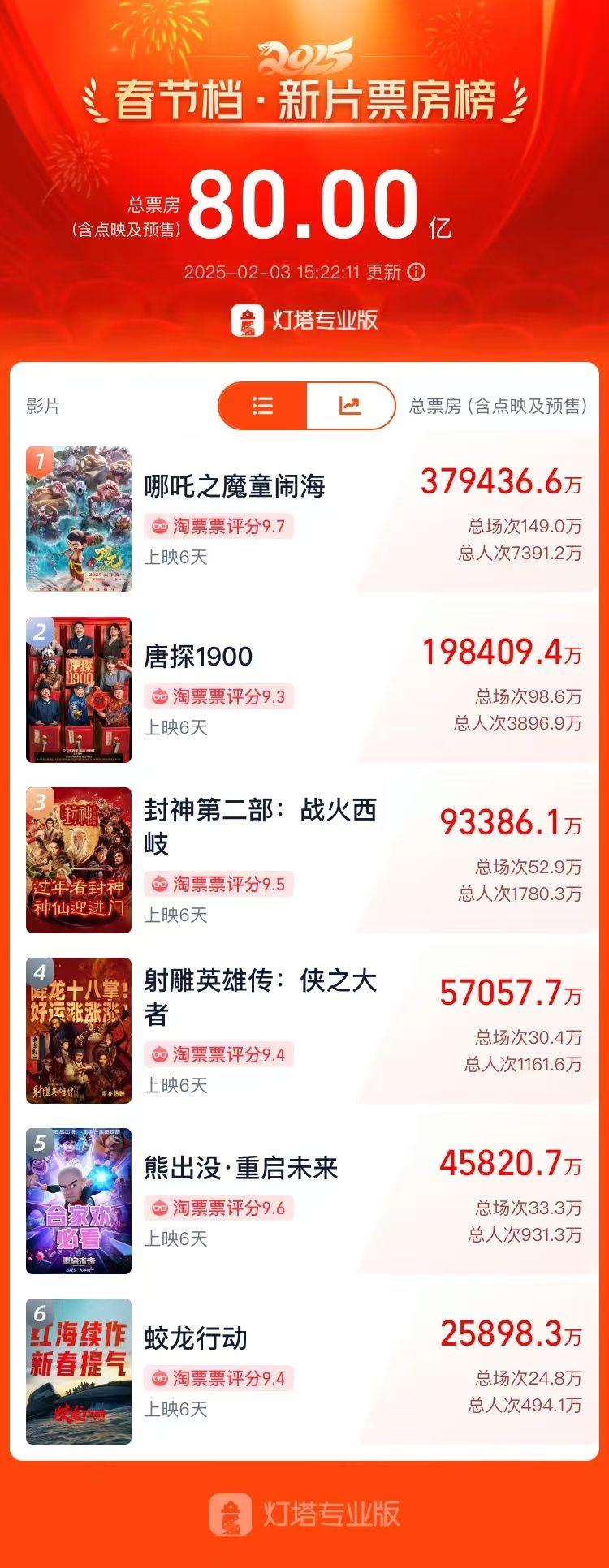 灯塔专业版数据显示,截至2月3日发稿前,今年春节档电影总票房(含预售)突破80亿元,再创新高!