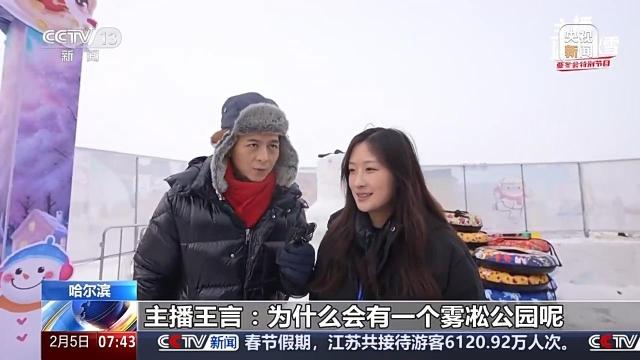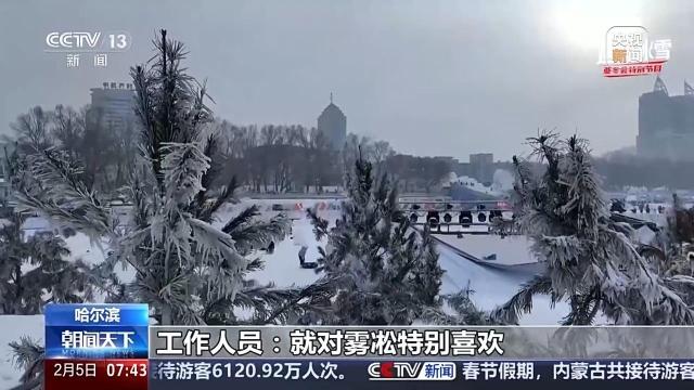 工作人员:去年哈尔滨旅游业的爆火,就是南方许多游客看见了这个雾凇公园,就对雾凇特别喜欢,所以今年我们特地打造了这个雾凇主题公园。