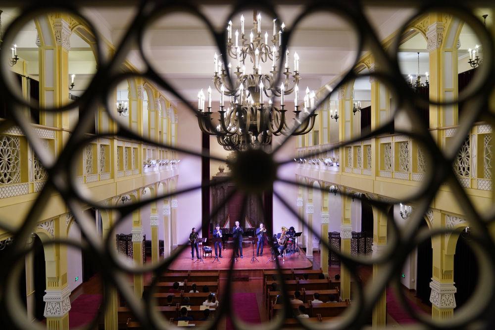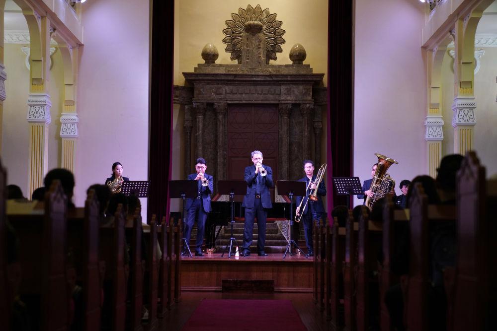 在哈尔滨老会堂音乐厅,市民欣赏韩国釜山市立交响乐团金色铜管乐队的专场音乐会(2019年8月24日摄)。