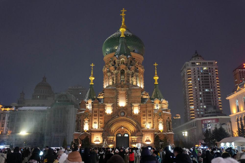 2024年1月11日,游客在哈尔滨建筑艺术广场游玩。