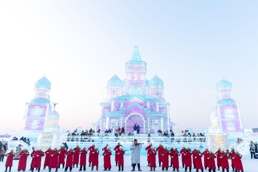 2025年1月12日,小提琴演奏家薛苏里与哈尔滨勋菲尔德少儿艺术团的小提琴演奏者在音乐“快闪”上演奏。