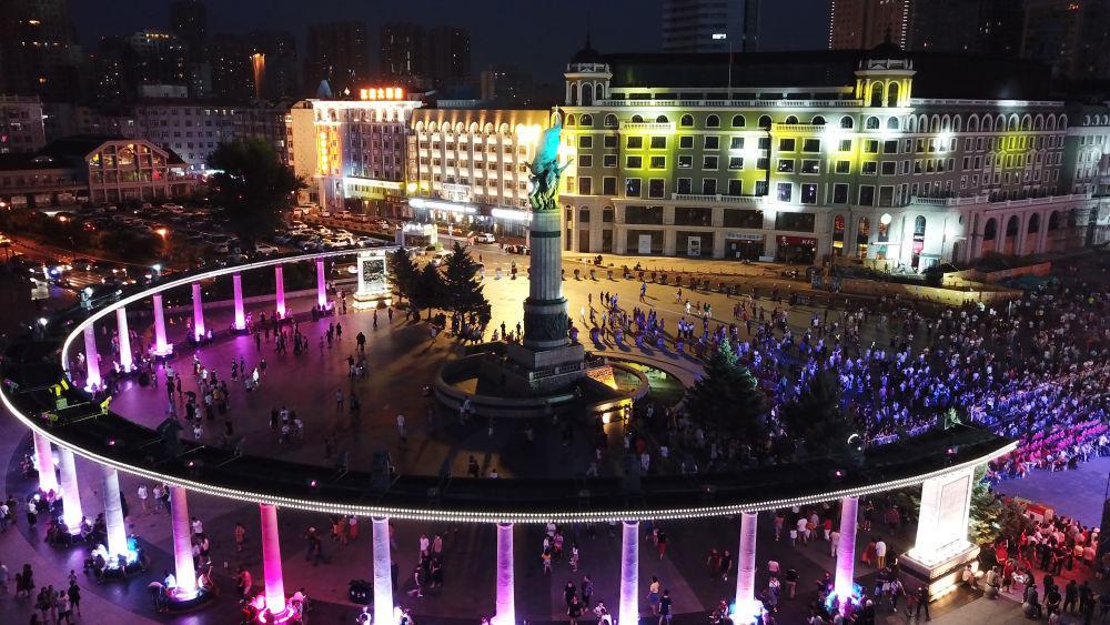 市民游客在哈尔滨防洪纪念塔广场观赏演出(2019年7月30日无人机拍摄)。
