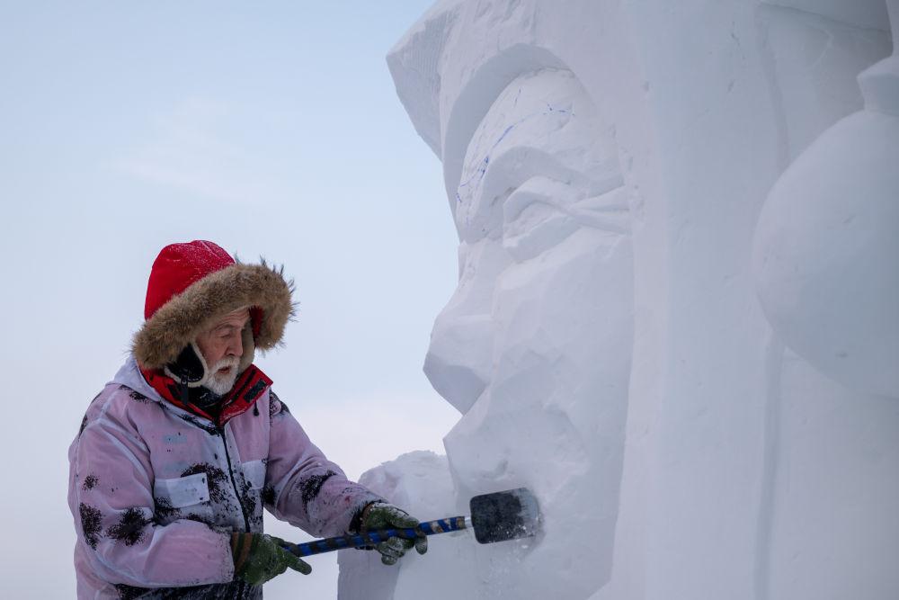 2025年1月7日,参赛选手在太阳岛雪博会园区内进行雪雕创作。