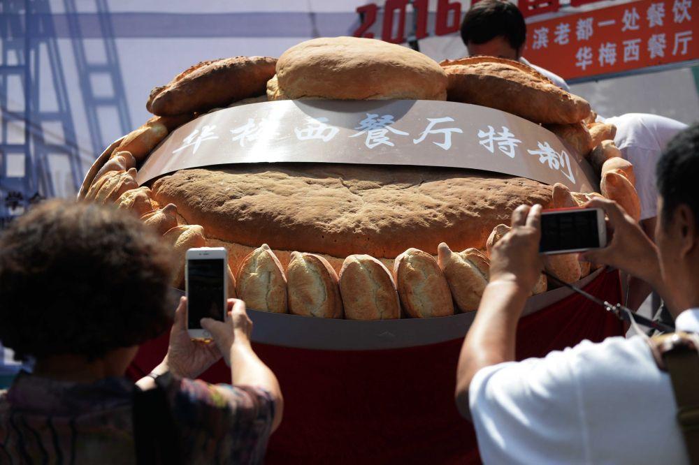 2016年6月25日,市民在拍摄开幕式上展示的俄式传统面包——大列巴。