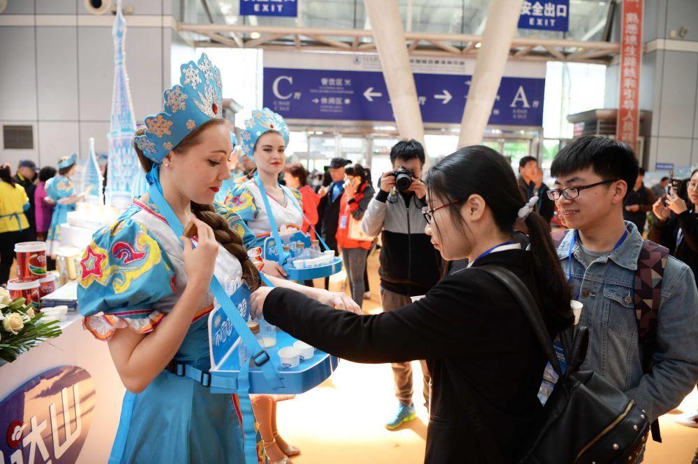 2017年4月21日,市民在2017中国国际乳业合作大会暨第十五届中国国际奶业展览会现场品尝乳制品。为期4天的展会吸引25个国家和地区的200余家乳企参展。
