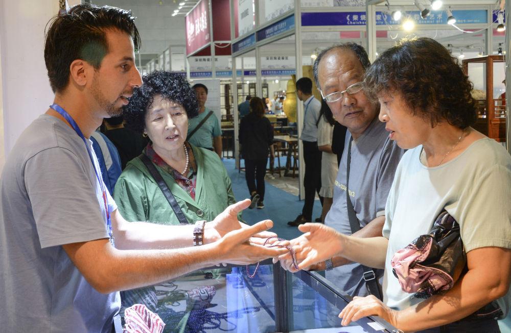 2019年7月17日,在第二届东北亚文化艺术博览会上,外国参展商向观众介绍展品。
