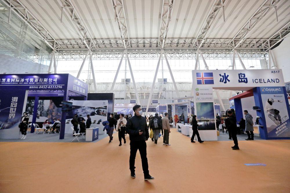 这是2023年3月17日拍摄的哈尔滨冰雪博览会现场。展会设置冰雪运动器材装备、冰雕工具、寒地食品、数字冰雪体验等展区,来自19个国家和地区的500余家企业线下线上共同参展。