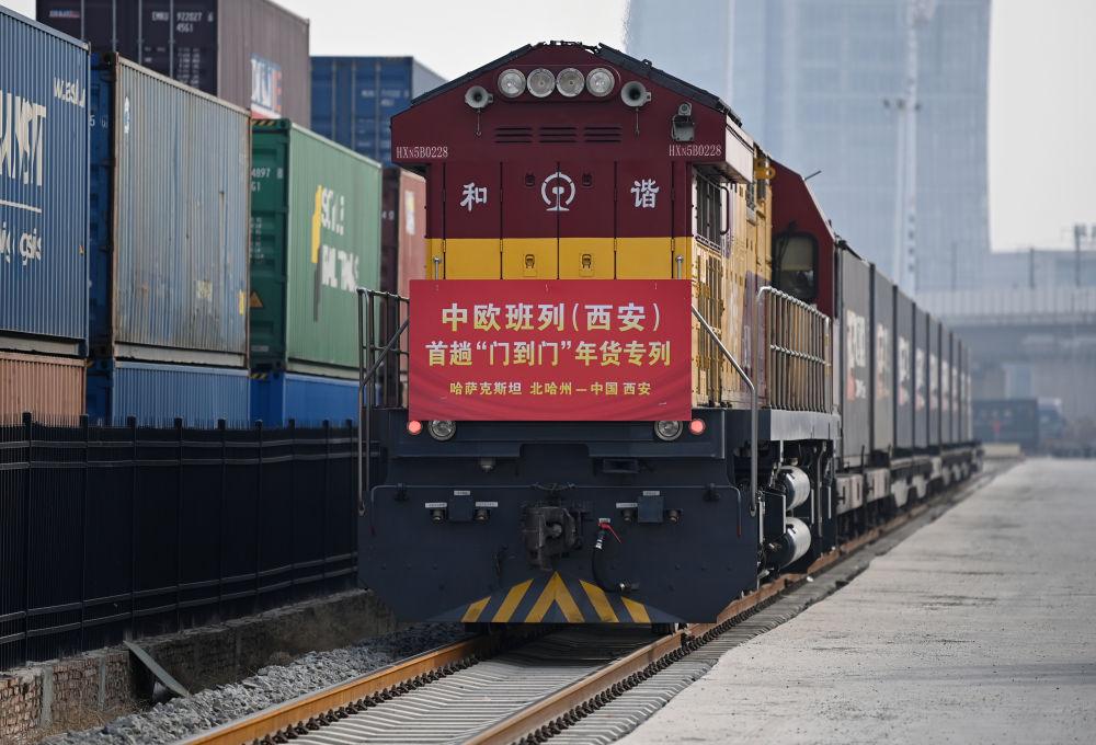 春节前,首趟中欧班列(西安)“门到门”年货专列开抵西安。新华社记者李一博摄