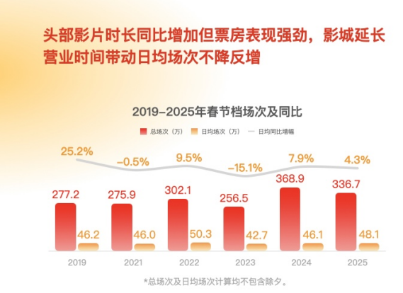 除《熊出没·重启未来》外,其他5部影片时长均超过2小时,在一定程度上会影响影院排片。但由于观众观影热情高,不少影城通过延长营业时间,增加排片,带动全国日均场次上升。