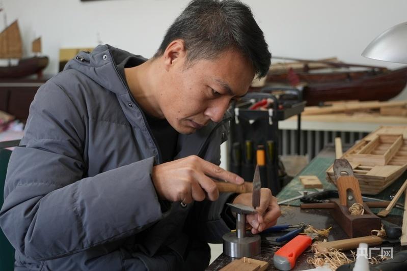 翟俊正在制作船模(央广网记者 周思杨 摄)