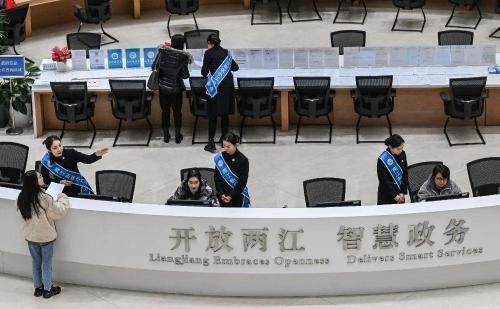 ▲2月5日,两江新区政务大厅,“小江帮办”人员正在指导办事群众填报材料。首席记者 龙帆 摄/视觉重庆