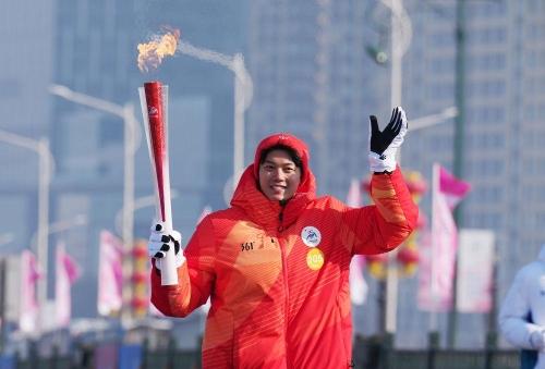 火炬手汪顺在传递火炬。新华社记者 王松 摄