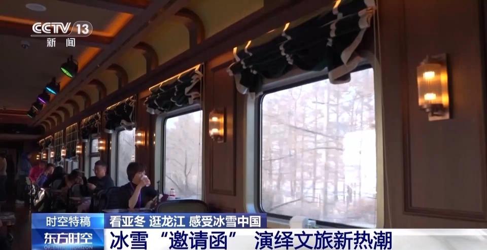今年,哈尔滨开行了多条旅游列车线路,在一趟旅游列车上,全车最受欢迎的特色之一就是全景式车厢。坐在窗前,穿越银白的雪乡,开过雾凇的林海,越过冰封的黑龙江,上车赏风景、下车玩冰雪,一路下来,尽赏北国冰雪风光。