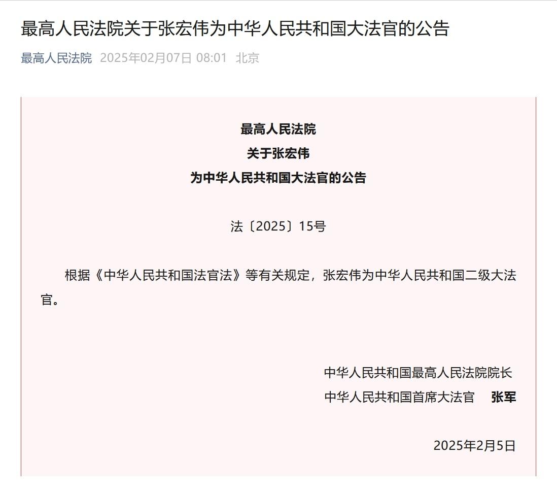 中新网2月7日电 据最高人民法院微信公众号消息,2月7日,最高人民法院发布关于张宏伟为中华人民共和国大法官的公告。详情: