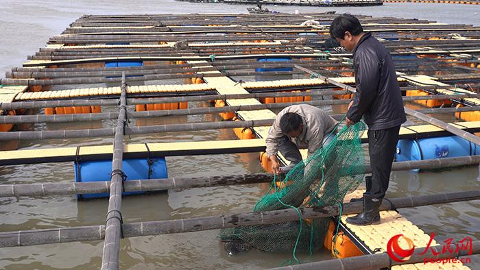 在福州日兴水产食品公司养殖场,养殖人员在查看鲍鱼生长情况。人民网记者 兰志飞摄
