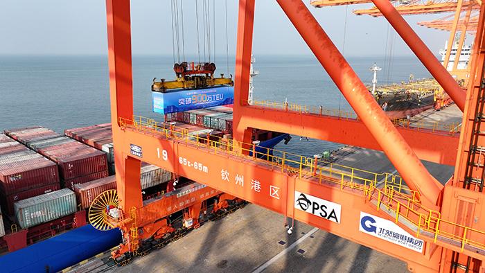 2024年,广西北部湾港第900万标箱起吊。陆奇东摄