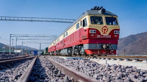 沈白高铁通化西站铺轨现场,火车正在运送建设材料。(10月25日摄)新华社记者 唐成卓 摄