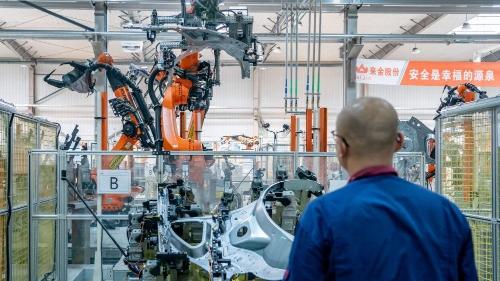 来金(长春)汽车零部件股份有限公司智能焊接总成车间内,机械臂自动焊接汽车冲压件。新华社记者 唐成卓 摄