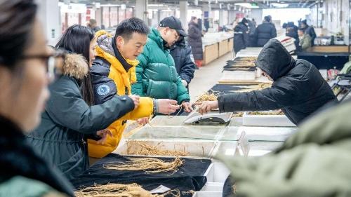 吉林省白山市抚松县的万良长白山人参交易市场内,顾客在选购人参。(1月15日摄)新华社记者 唐成卓 摄