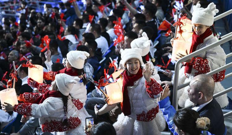 在张灯结彩的“中国雪乡”画卷前,演员手持双色“冰凌手绢花”旋转翻腾,一面为冰晶蓝,一面为中国红。亚冬会开闭幕式视觉总设计刘猛说,在中国东北,“手绢花”是喜庆祥和的年味标识,表达东道主喜迎八方宾朋的盛情。