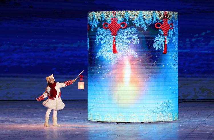 一个穿白衣裙、戴红围巾的女孩提着盈盈微光的小冰灯,点亮舞台中央的大冰灯。随后,34名孩童手提冰灯围合环抱在一起,象征本届亚冬会34个亚洲参赛国家和地区凝心聚力,共同点亮梦想。