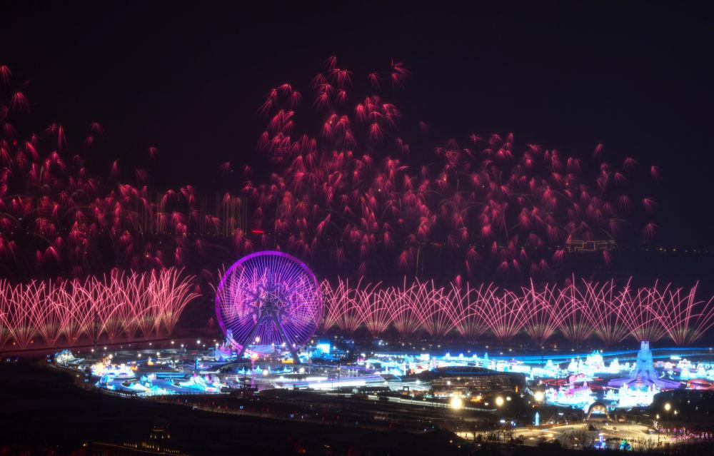 2025年2月7日,焰火在开幕式分会场上空绽放。