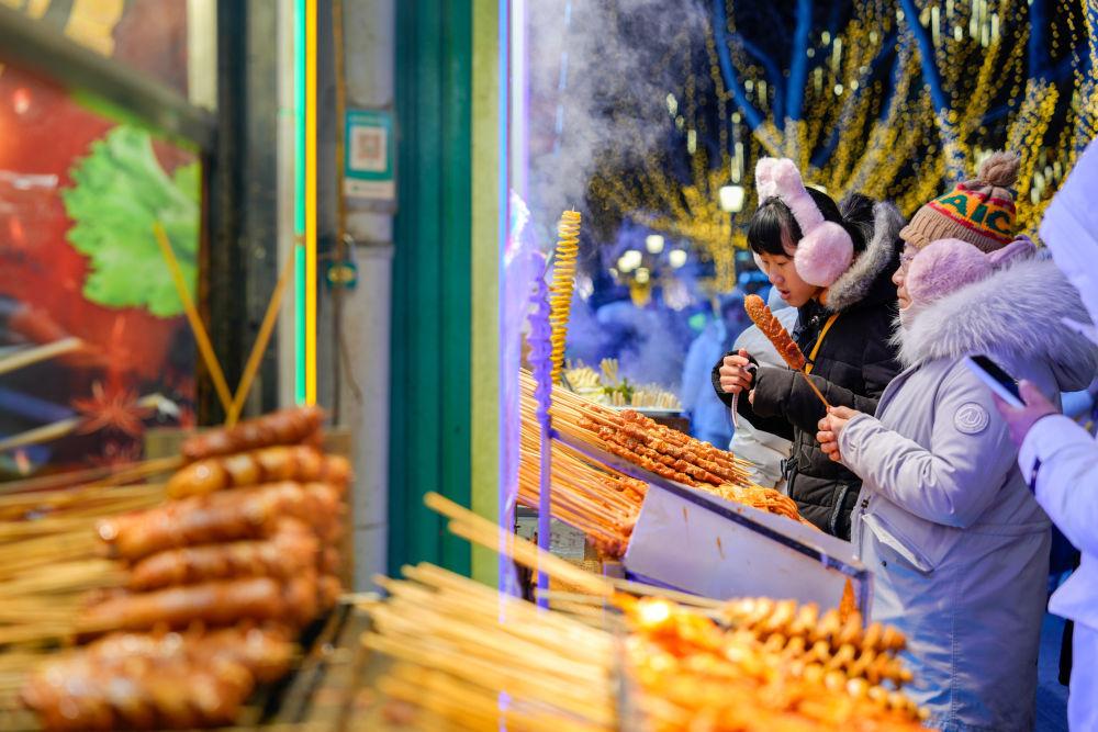 2025年1月30日,游客在哈尔滨中央大街上品尝烤肠。