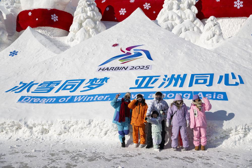 2025年1月8日,在哈尔滨中央大街,游客在亚冬会倒计时景观前拍照留念。当日,第九届亚冬会迎来开幕倒计时30天。