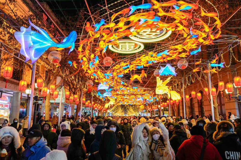 2025年1月30日,游客在哈尔滨中央大街上游玩、拍照。