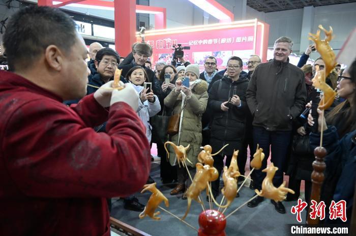 2月7日,多位驻华使节在廊坊国际年货节上被吹糖人技艺吸引。中新社记者 翟羽佳 摄