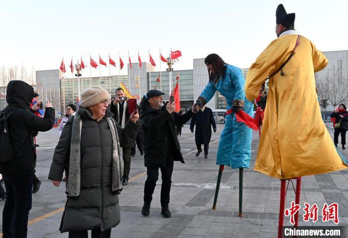 2月7日,驻华使节团成员与踩高跷表演者交流。中新社记者 翟羽佳 摄
