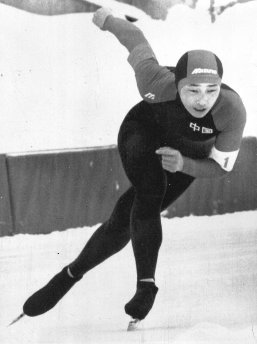 1986年3月3日,中国运动员王秀丽在日本举行的第一届亚洲冬季运动会女子1000米速滑比赛中获得金牌。图为王秀丽在比赛中。传真照片(新华社发)