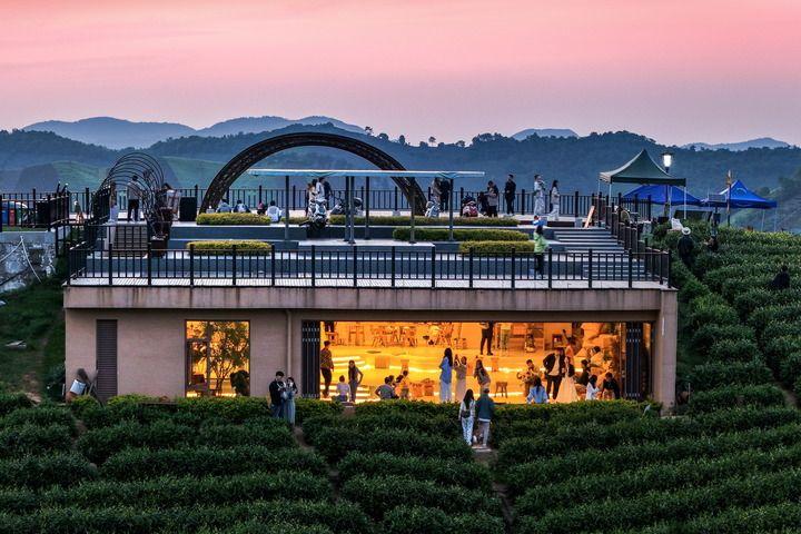 安吉溪龙乡白茶原观景平台及网红咖啡店的游客络绎不绝(2024年5月2日摄,无人机照片)。新华社发(潘学康摄)