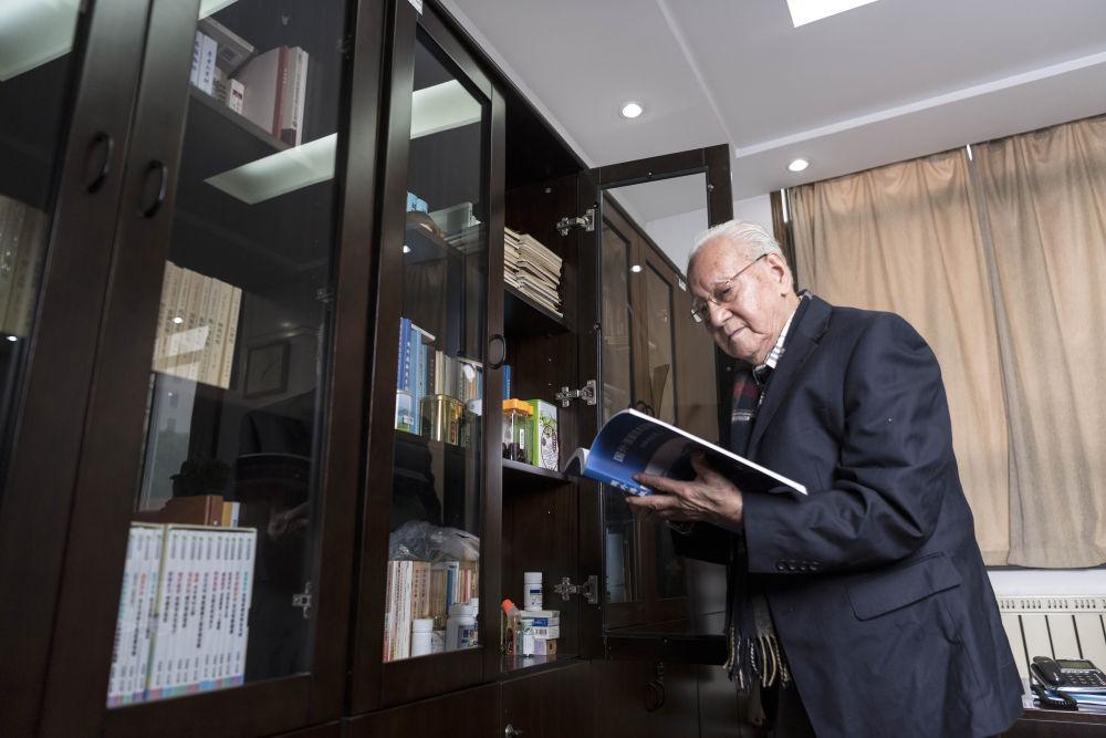 黄旭华院士在办公室查阅资料(2017年12月15日摄)。1970年12月26日,中国第一艘核潜艇下水。当“蓝色巨鲸”奔向大海之际,在场的人无不热血沸腾,他更是喜极而泣。新华社记者熊琦摄