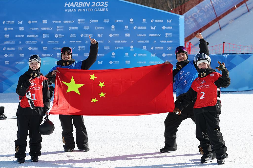 △2025年2月10日,中国队包揽哈尔滨亚冬会单板滑雪大跳台男、女组冠亚军。(从左至右:张小楠、杨文龙、姜鑫杰、熊诗芮)