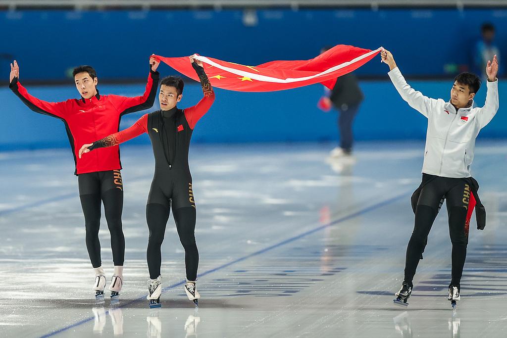 △2025年2月10日,高亭宇(右)、廉子文(左)和宁忠岩(中)组成的中国队夺取哈尔滨亚冬会速度滑冰男子短距离团体追逐赛冠军。