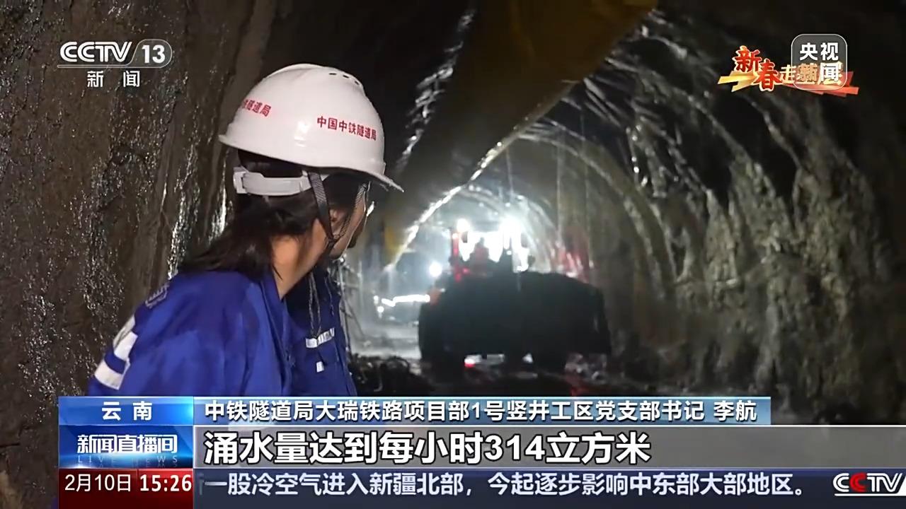 中铁隧道局大瑞铁路项目部1号竖井工区党支部书记 李航:竖井施工期间最怕的就是突涌水。我们遇到了最大一次突涌水险情,涌水量达到每小时314m³,严重超出了抽排水能力,一晚上就把630米深的竖井全部灌满,等于白干,单抽排水就花了5个月的时间。