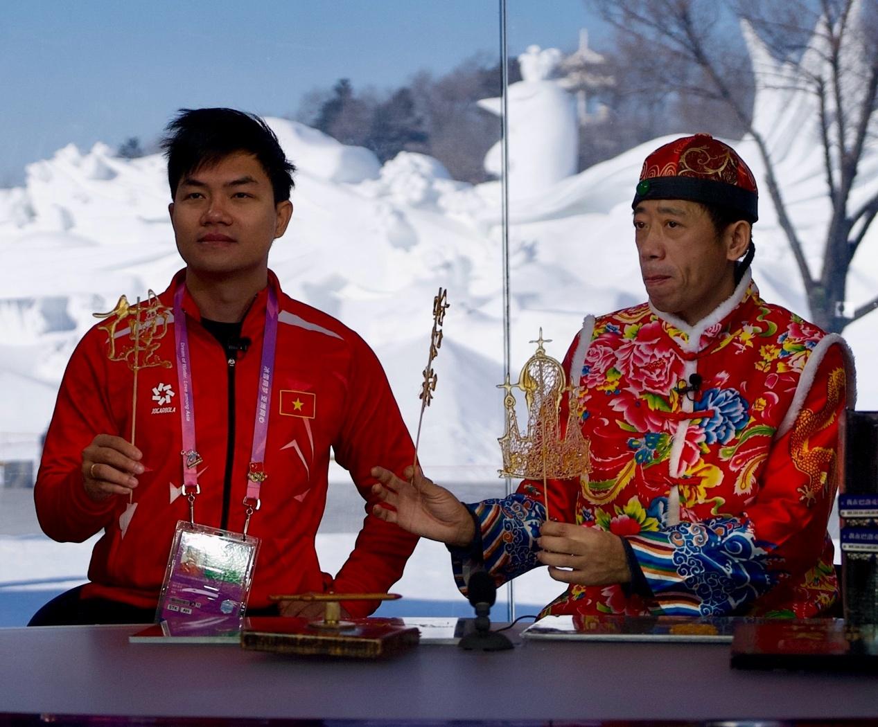 来自蒙古国、泰国、菲律宾、越南、印度、尼泊尔等国的近20位运动员、体育代表团官员和媒体人,在赛场上比拼之后,欢聚在哈尔滨太阳岛雪博会中央广播电视总台的演播室,在冰天雪地中共庆新春。