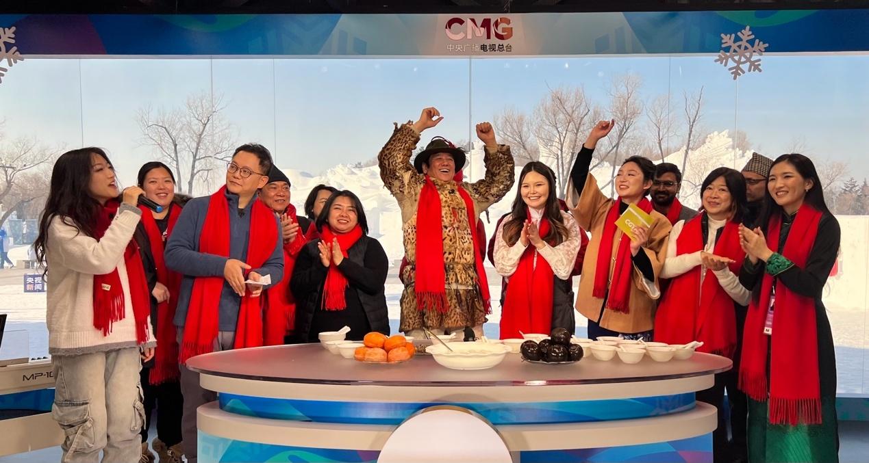 参加“当亚冬会遇上‘非遗年’”人文交流活动的中外嘉宾在哈尔滨太阳岛雪博会CMG演播室同庆新春