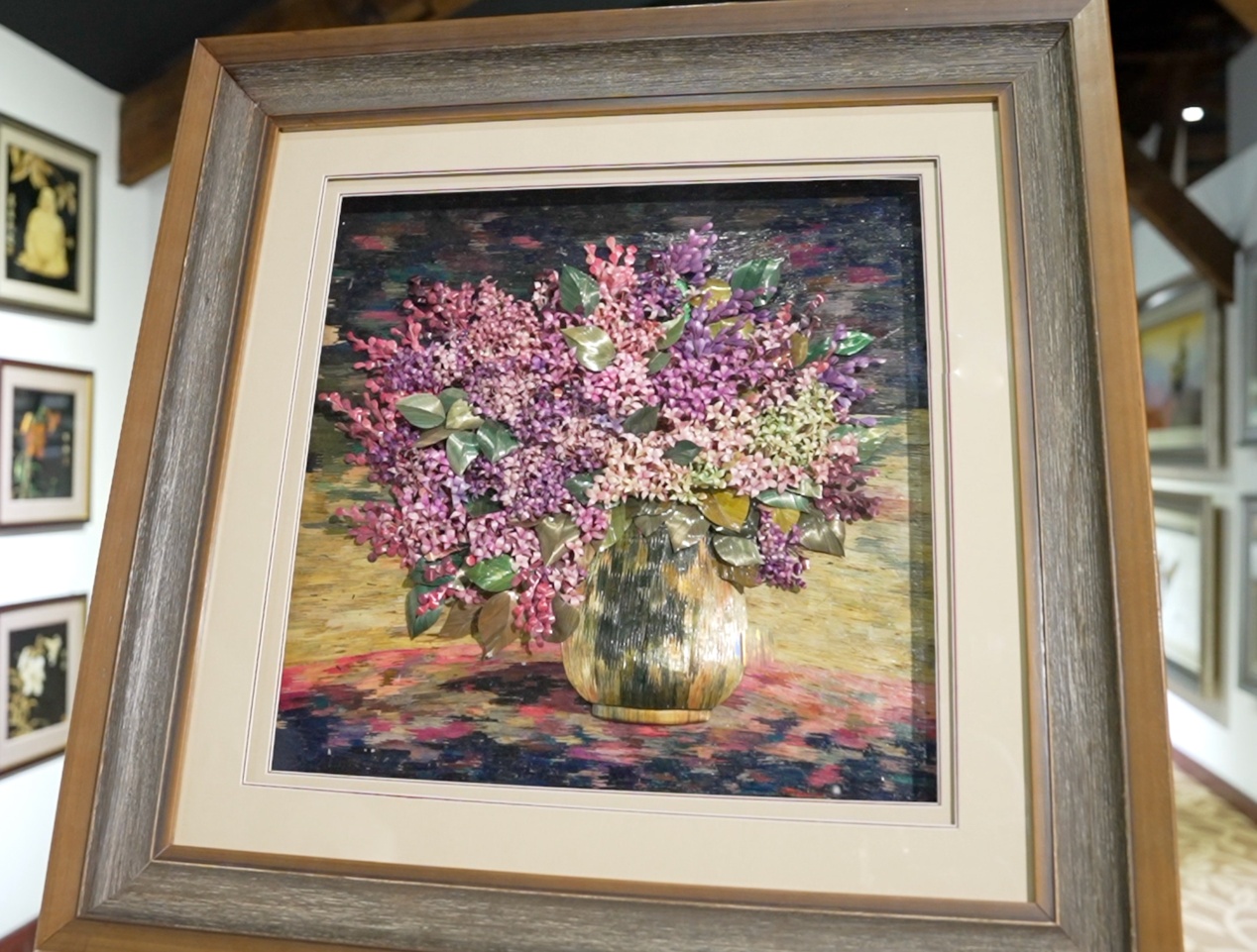 麦秸画是以生长在东北黑土地上的麦秆为原料,利用其自然光泽、纹理和质感,经过选料、泡、煮、染、刮等十几道手工制作工序,将花卉、风景、建筑、人物、动物等生动形象地表现出来。
