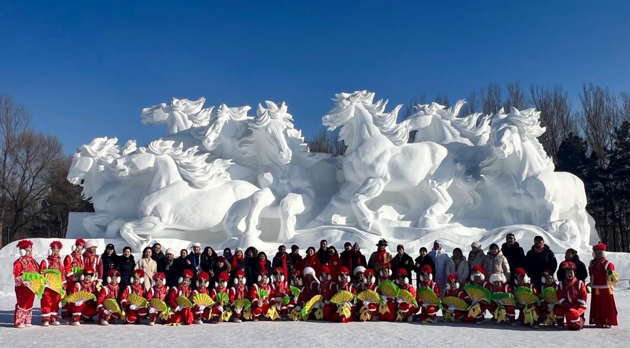参加活动的中外友人在雪博会雪雕作品《八骏踏雪》前合影