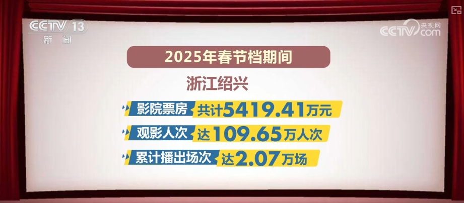 据统计,2025年春节档期间,浙江绍兴的影院票房共计5419.41万元,观影人次达109.65万人次,累计播出场次达2.07万场,影院票房同比2024年增长34.94%,观影人数同比增长30.06%。