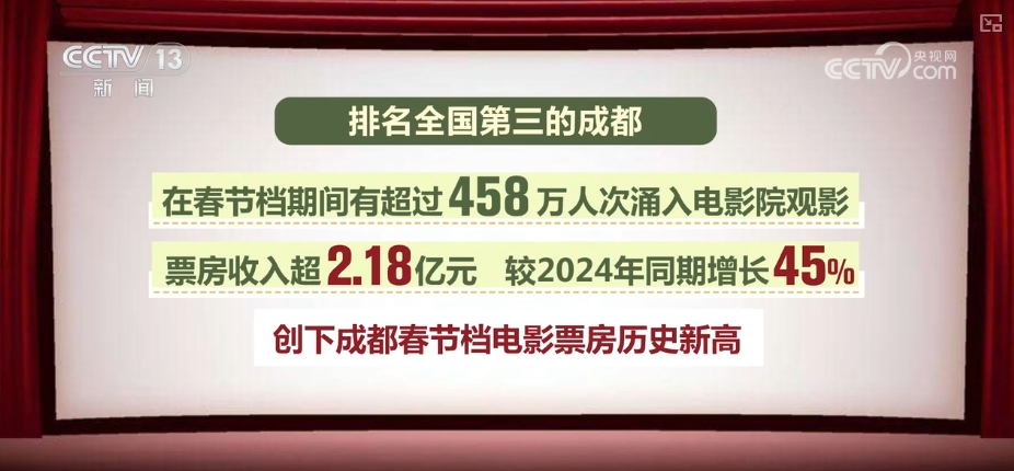 其中,排名全国第三的成都,在春节档期间有超过458万人次涌入电影院观影,票房收入超2.18亿元,较2024年同期增长45%,创下成都春节档电影票房历史新高。
