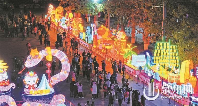 逛洛阳古桥、游八仙过海、品郑和家宴……公园主广场两侧的座灯同样璀璨夺目,各有故事,不少人饶有兴致地边看边聊。往公园里面走去,便能看到全市唯一的大型水上灯组《蛇舞海丝》,该灯组长40米,高8米,以洛阳桥为主要载体,融合了东西塔、漆线雕、月光宝塔等文化元素。