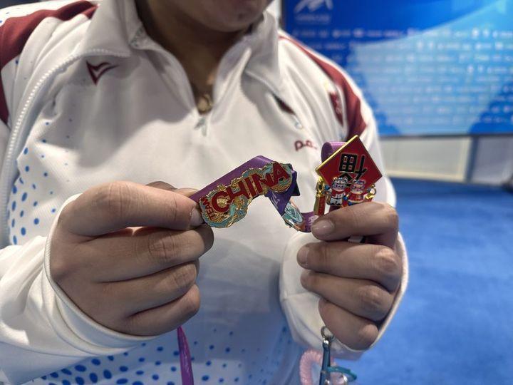 “这是我接机的时候,一名中国香港队运动员送给我的,她很喜欢我的一个大熊猫‘pin’。”亚冬会志愿者翟晋涵展示着一枚中国香港代表团徽章说,“跟大家交换徽章真的很有意思。”