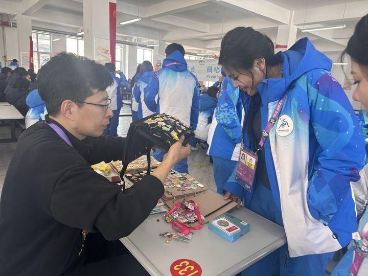 换“pin”,也就是交换徽章,在世界体育大赛中历史悠久。在早期的奥运会上,赛事参与者通过交换用于身份识别的圆形纸牌,表达对彼此的美好祝愿。如今,换“pin”已成为各大体育赛事中的社交传统,亚冬会也不例外。